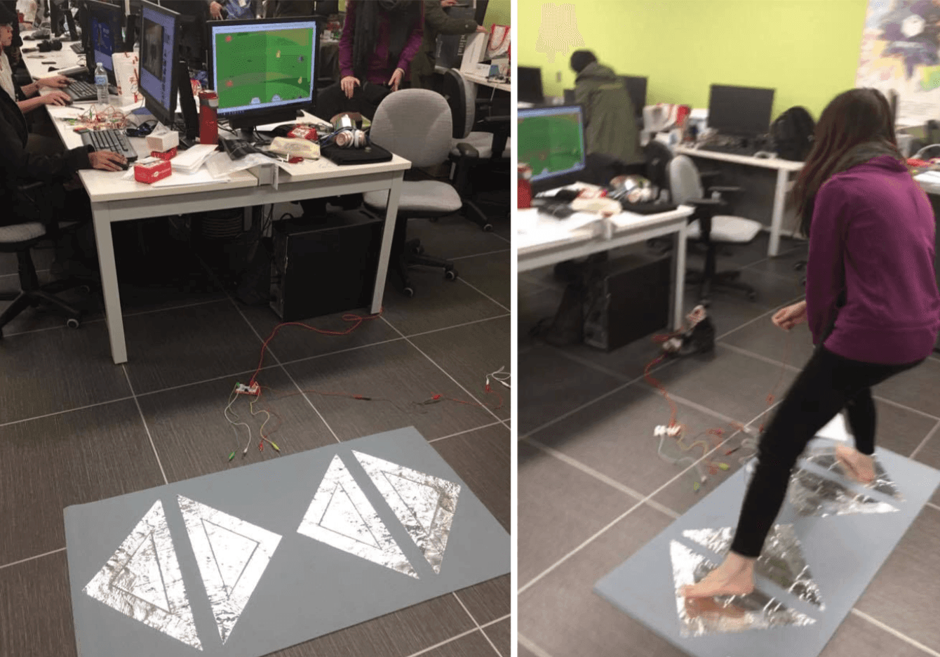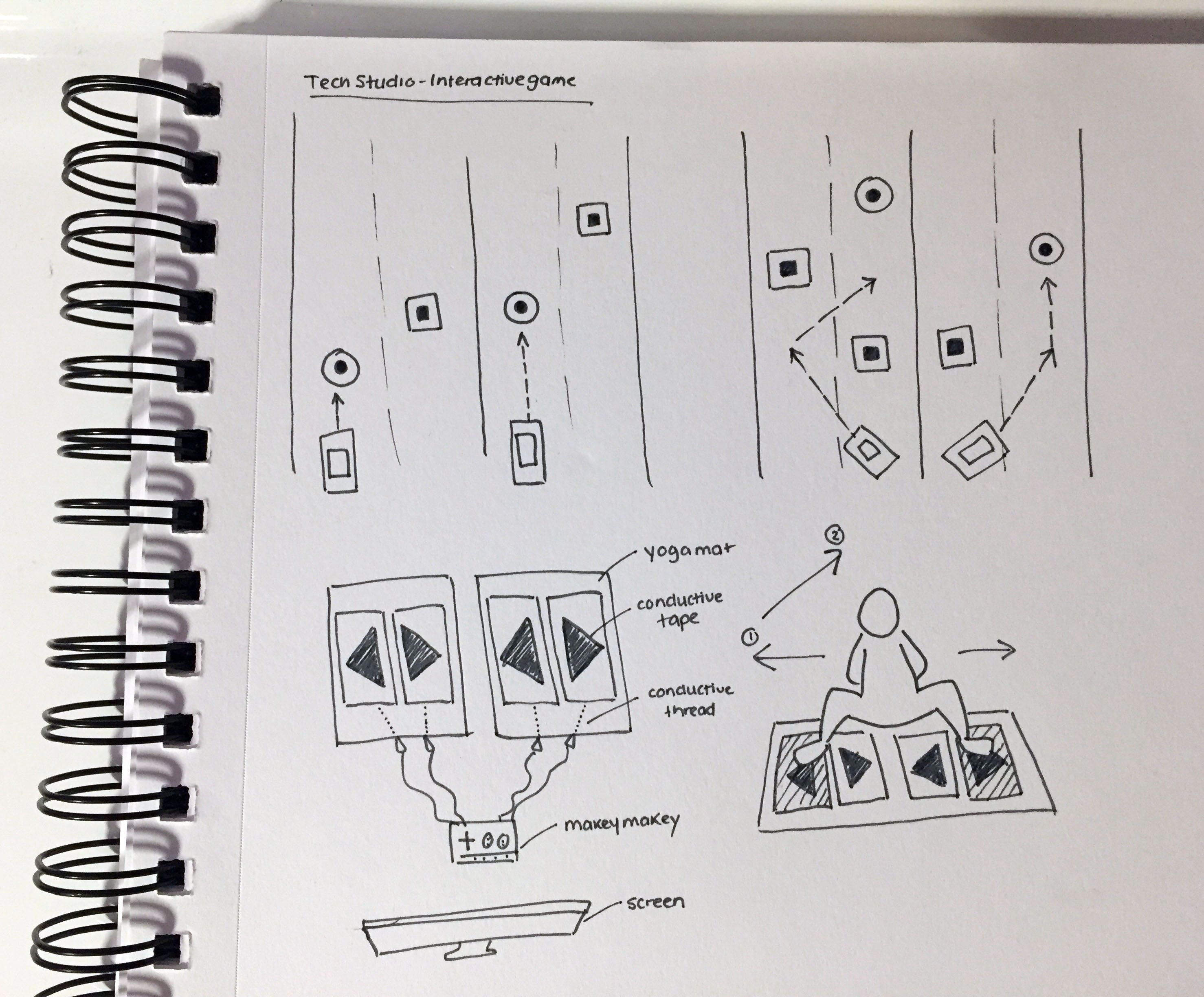 We built a paper prototype of the mat with foil tape and conductive thread. This would ensure that keypress events and LED lights worked the way we wanted before having it transferred to the working prototype. For the game, we animated on the HTML5 Canvas with the zim.js and EaselJS external libraries.