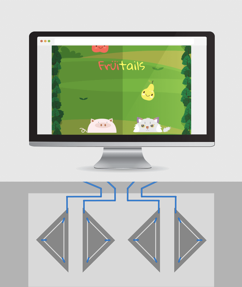 Fruitails is a split screen catch game with an interactive mat controller created for a Tech Studio Design course. Players control the movement of two characters, with their feet, at the same time. There are four buttons on the mat used as arrow keys. LED lights are synced with all key press to indicate that the mat is responsive.