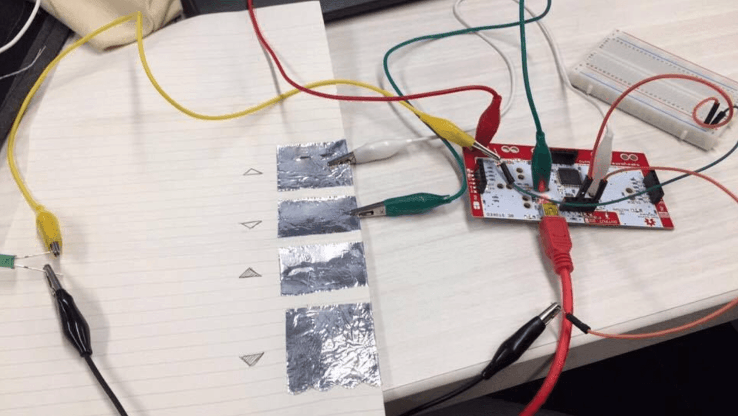 While researching conductive material, we went from pressure sensors to using foil tape and conductive thread which greatly expanded the area that players can use.< It was also less costly and more durable than the other options we researched such as Velostat or conductive fabric. We got two LED lights to light up when extending keyboard pins into the breadboard.